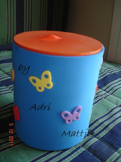 Quando comecei a fazer as fofuchas durante os cursos vi também outras possibilidades, como reciclar vários tipos de materiais, neste caso potes de todos os tipos e tamanhos e para todas utilidades.Este era um potinho de cappuccino, agora talves um porta algodão... cotonetes...etc...